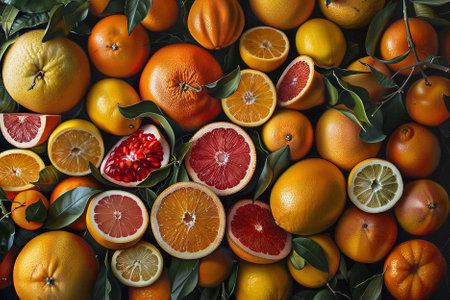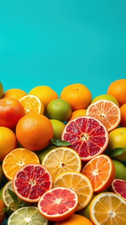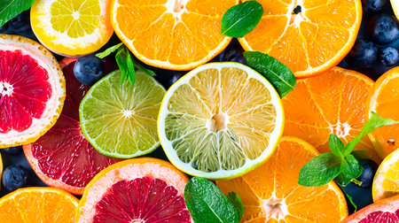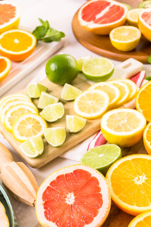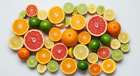 Citrus fruit background with sliced f oranges lemons lime tangerines and grapefruit as a symbol of healthy eating and immune system boost with natural vitamins.