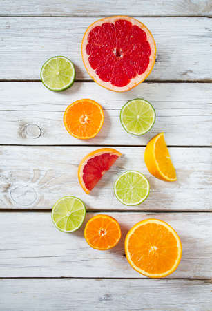 Citrus fruits. Oranges, limes, grapefruits, tangerines and lemons. Over white wood table background with copy space. Top view