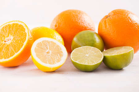Citrus fruits with orange, lemon, grapefruit and lime on white background.