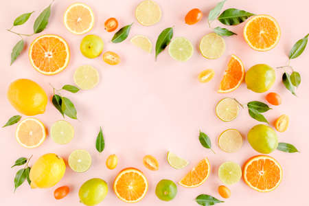 Frame made of summer tropical fruits: orange, lemon, lime, mango on pink background. Food concept. flat lay, top view