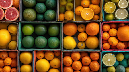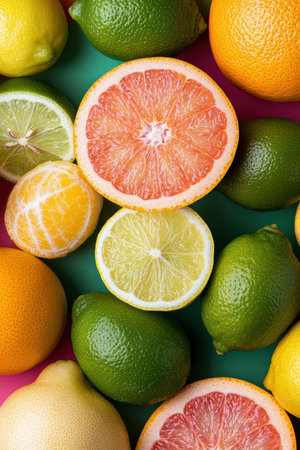 Different varieties of citrus fruits, oranges, lemons, limes, kiwis arranged in the rows. Colorful background, top view