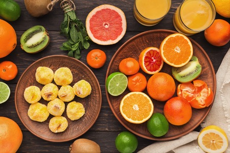 Platter with assorted citruses on rustic wooden background, copy space. Top view on oranges, lemons, tangerines and exotic rahat lakoum, flat lay