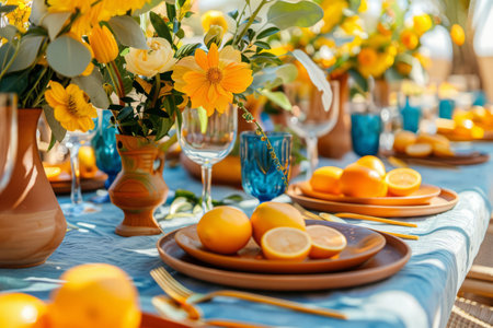 Mediterranean inspired outdoor summer table setting. Generative AI illustration