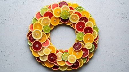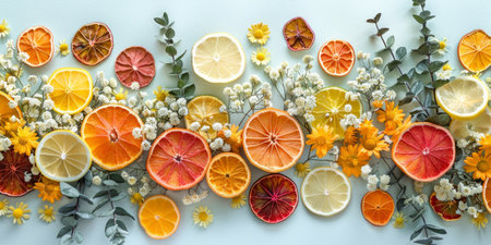 Fresh citrus slices and blossoms forming geometric flat lay design, colorful vibrant summer stock pattern, refreshing healthy vibe