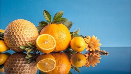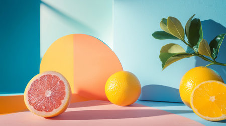A colorful still life composition featuring fresh citrus fruits and a leafy plant, creating a cheerful atmosphere. The vibrant blue and orange backdrop enhances the visual appeal.