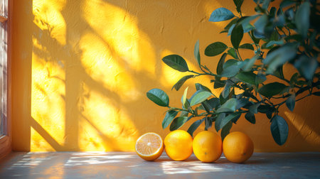 A vibrant still life featuring fresh oranges arranged on a rustic table, illuminated by warm sunlight and surrounded by green leaves.