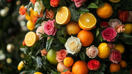 Vibrant arrangement of colorful roses and citrus fruits during spring season decoration