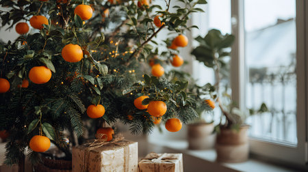 Bright citrus Christmas tree decorated with oranges and lights, with wrapped gifts placed by a snowy window.