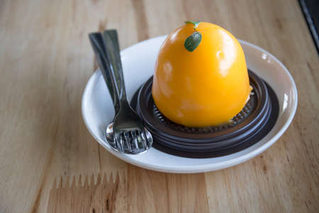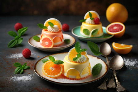 fruity citrus mousse cakes with cream on plate, created with generative ai