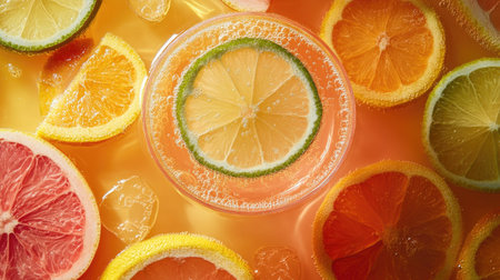 Top-down view of tropical fruit juice with water and floating slices. Copy space available on the top.