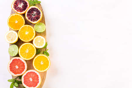 slices of orange and lime, sprigs of mint lie on a white table. food backgrounds