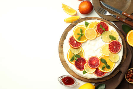 Concept of tasty dessert with meringue pie with citrus, space for text