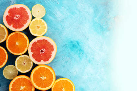 Citrus fruits with orange, lemon, grapefruit and lime on blue background
