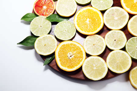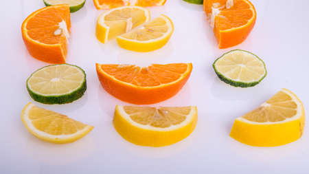 Lemon, orange, lime slices on a white background, isolated, creative layout, space for text, top view