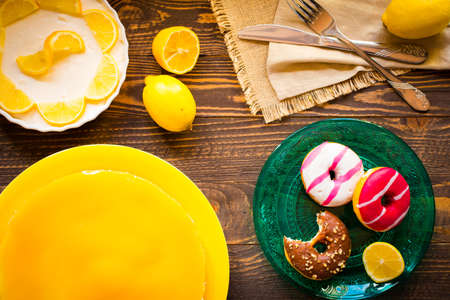 Homemade lemon cheesecake, very simple delicious cake, on a wooden background