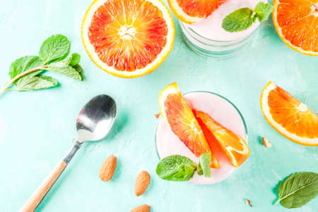 Healthy breakfast, Blood Orange Parfait with granola. yogurt, almond and mint, light blue background, copy space top view