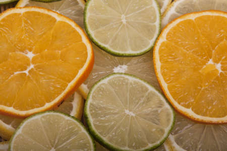 Slices of grapefruit, orange, lemon and lime standing on top of each other.