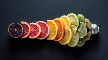 This image features various sliced citrus fruits arranged in a light bulb shape. The composition includes oranges, lemons, limes, and other fruits. The fruits are vibrantly colored against a dark backdrop, creating a visually striking contrast. This creative concept could be utilized for design, health, or food-related purposes.