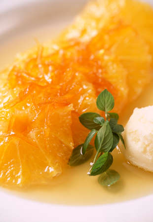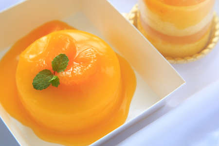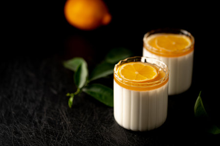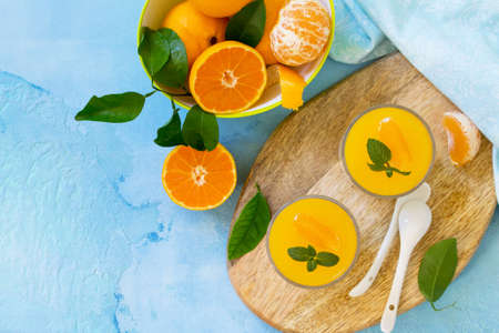 Panna cotta with tangerines jelly and mint, Italian dessert, homemade cuisine. Top view flat lay background. Copy space.