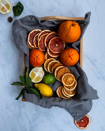 Top view of a wooden basket with fresh oranges and dried oranges on a gray background