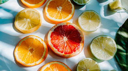 An overhead view displays a colorful assortment of citrus fruits, including oranges and limes, both whole and sliced. Green leaves add texture and contrast against the light background. This arrangement creates a fresh and appealing image suitable for illustrating various culinary or healthy lifestyle concepts.
