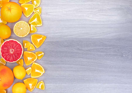 Various citrus fruit cut into slices orange, lemon, lime, grapefruit, pomelo and a glass of orange juice. Spread out on a wooden board and a vintage white plate on the background of natural wood texturing.