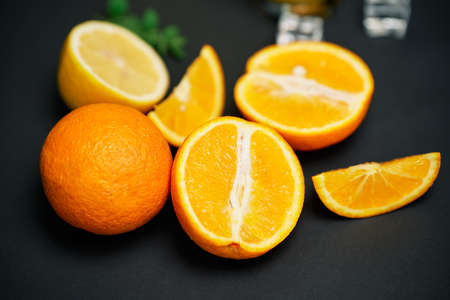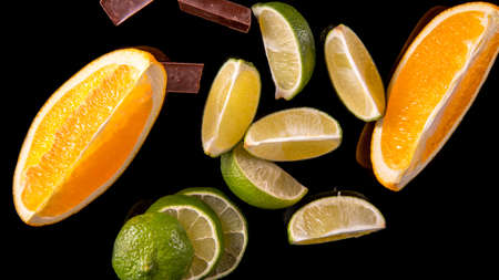 Red orange lime sliced and whole, on black background, close-up, copy space, template, postcard