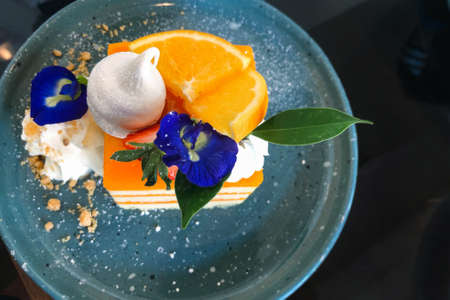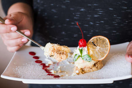Customer eating creamy orange dessert serving on square cut plate in restaurant. Delicious cake decorated by dried citrus, cherry and mint, close up picture