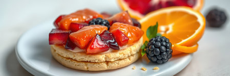 Colorful fruit tart on a white plate with vibrant blackberries and orange slices served on a table