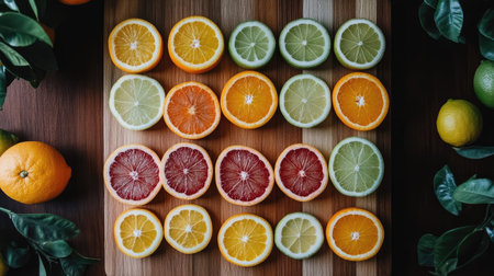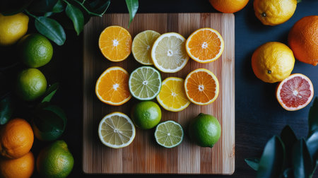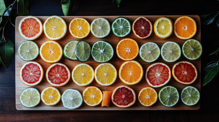 A collection of sliced citrus fruits, including oranges, lemons, and limes, arranged in a circular pattern on a wooden board.