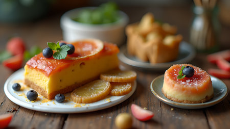 Close up shot of homemade cheesecakes served with orange slices and blueberries on a rustic wooden table, offering a delightful and sweet dessert experience.