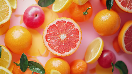 A colorful assortment of fresh citrus fruits, including oranges, lemons, and grapefruits, arranged on a soft pink background, evoking freshness and summer.