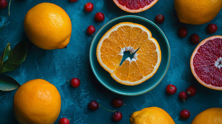 Close-up of fresh citrus fruits and cherries artfully arranged on a textured dark teal background, highlighting vibrant colors and natural textures.