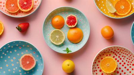 A colorful top-down view of citrus fruits and a strawberry arranged on playful polka-dot plates. Perfect for food, summer, or cheerful themes.