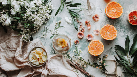 A rustic and artistic display featuring fresh citrus fruits and arranged flowers on a textured surface.