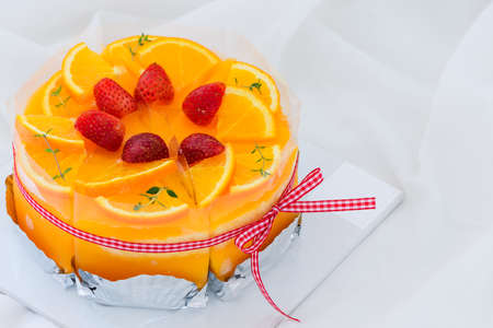 Orange cake decorated with slide fresh orange and strawberries on top, Home made cake concept