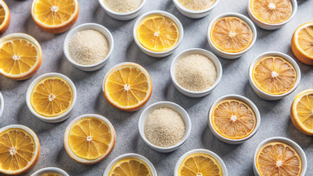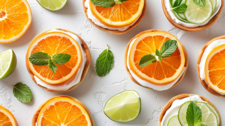 Top View, Mini Orange and Lime Cakes on White Background, Sweet Citrus Dessert, Pattern