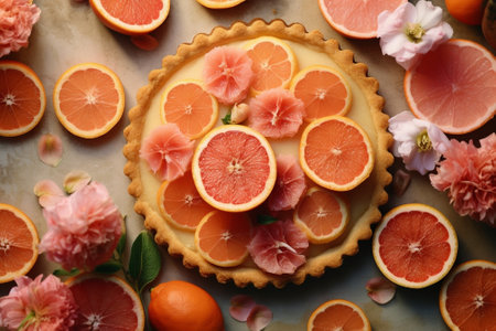 Generative AI : Creme brulee grapefruit custard tart Grey stone background