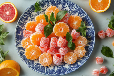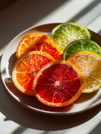 Vibrant citrus segments arranged on a clean white dish, illuminated by gentle sunlight, evoking freshness and sun-kissed zest perfect for summer scenes.