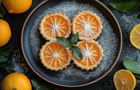 Three orange tarts are arranged on a black plate, dusted with powdered sugar. Surrounding the tarts are whole oranges, lemon slices, and fresh mint leaves, adding vibrant colors.