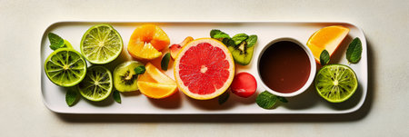 A vibrant breakfast board showcases an assortment of fresh fruits like kiwi, grapefruit, and strawberries neatly arranged on a wooden platter, perfect for a healthy morning start, banner