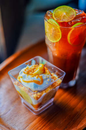 Banoffee Cake with caramelize bananas in cup and ice tea on wood table,Sweet Homemade