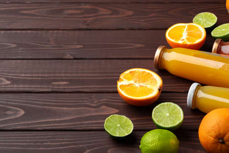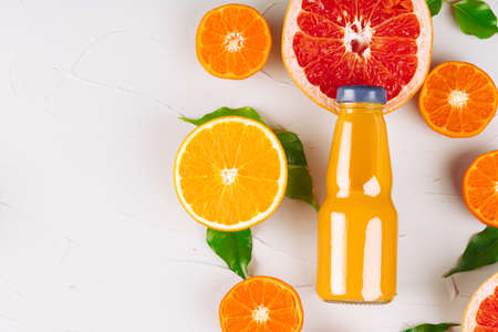 Glass bottle of fresh squeezing Orange juice with sliced fruits on concrete background. Fruit juice, fresh cold drink. Refreshment in summer. Fruits cut in half. Copy space