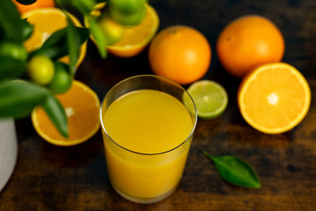 Close-up of cut oranges on a table. Orange juice in a glass. High quality photo