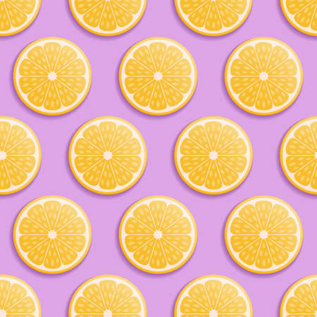 Seamless pattern pink citrus fruit orange lemon lying on violet surface. Colorful fresh citrus slice wallpaper. Creative vivid vibrant color, summer friuts concept. Minimal pop art style