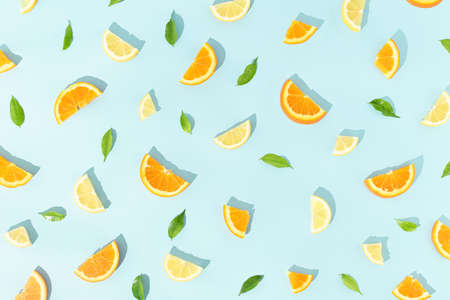 Creative fruit pattern made with slices of lemon, oranges and green leaves on bright blue background. Minimal food concept. Flat lay.