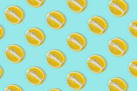 Colorful fruit pattern of lemon slices on blue