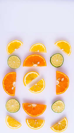 Lemon, orange, lime slices on a white background, isolated, creative layout, space for text, top view