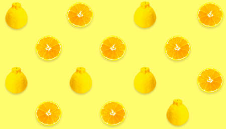 Fresh fruit pattern of Sumo mandarin fresh Orange slices on yellow background,Summer,Autumn cocept.