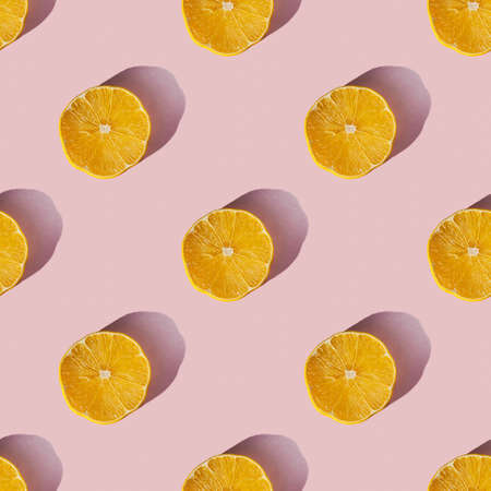 Top down view on pink abstract background with slices of ripe orange or lemon citrus in pattern - trendy minimal flat lay food summer concept